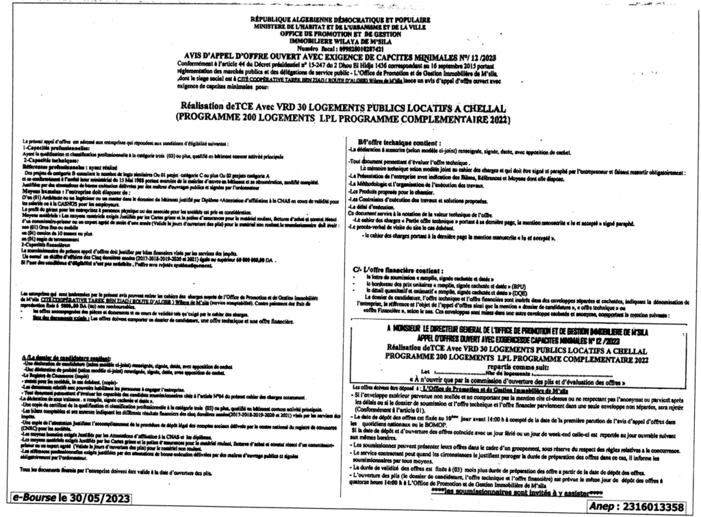 Avis d’appel d’offre ouvert N°12/2023 Office de Promotion et de Gestion Immobilier wilaya de M’sila