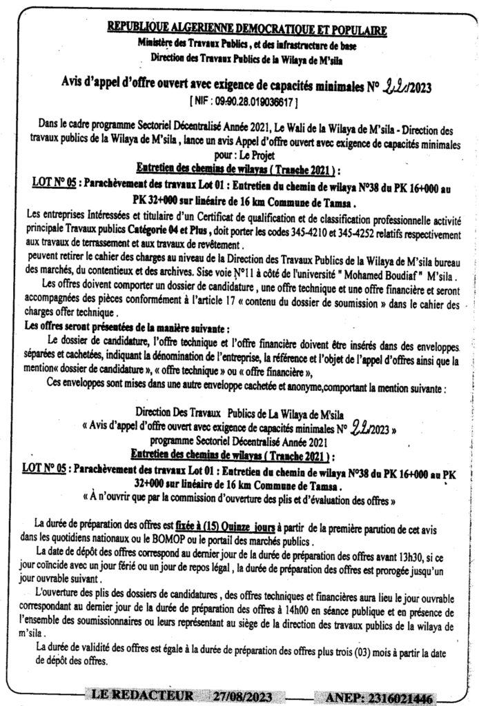 Avis d’appel d’offre ouvert N°22/2023 Direction des travaux publics de la wilaya de M’sila