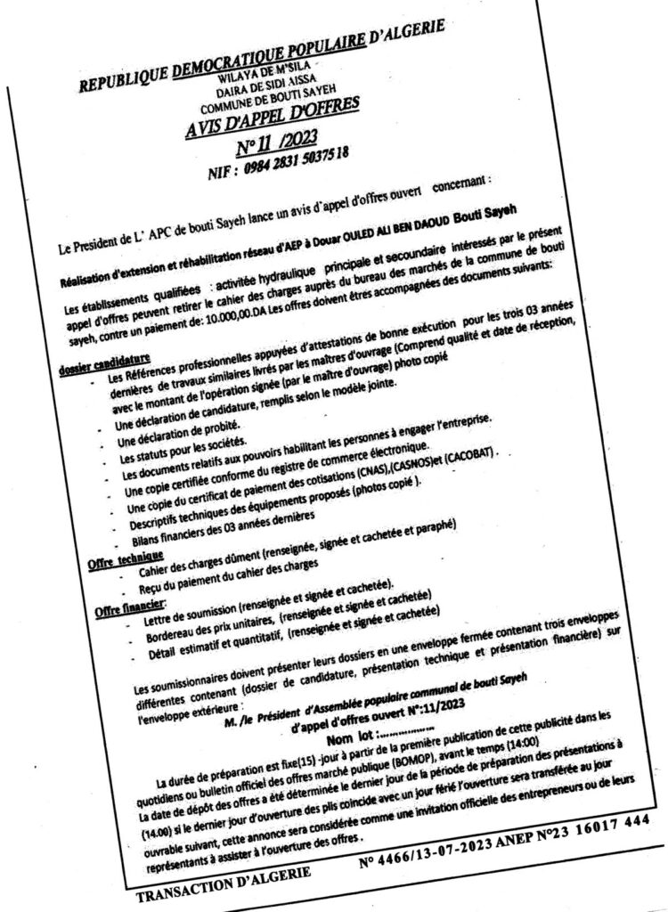Avis d’appel d’offres N°11/2023 Commune de Bouti Sayeh