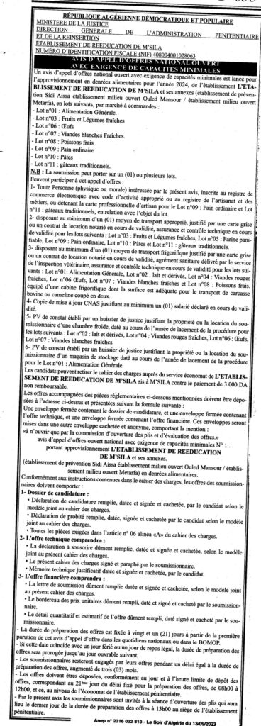 Avis d’appel d’offres national ouvert/ Établissement de rééducation de M’sila