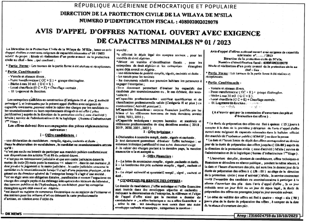 Avis d’appel d’offres national ouvert N°01L2023 Direction de la protection civile de la wilaya de M’sila