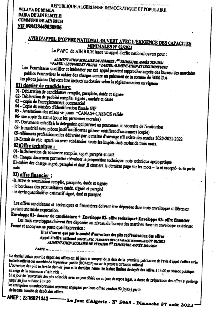 Avis d’appel d’offres national ouvert N°02/2023 Commune de Ain rich