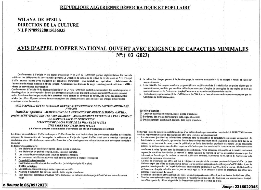 Avis d’appel d’offres national ouvert N°03/2023 Direction de la culture wilaya de M’sila