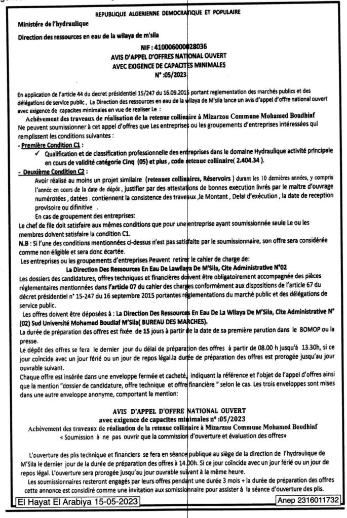 Avis d’appel d’offres national ouvert N°05/2023: Achèvement des travaux de réalisation de la retenue collinaire a Mizarzou Commune Mohamed Boudhiaf/ Direction des ressources en eau de la wilaya de M’sila