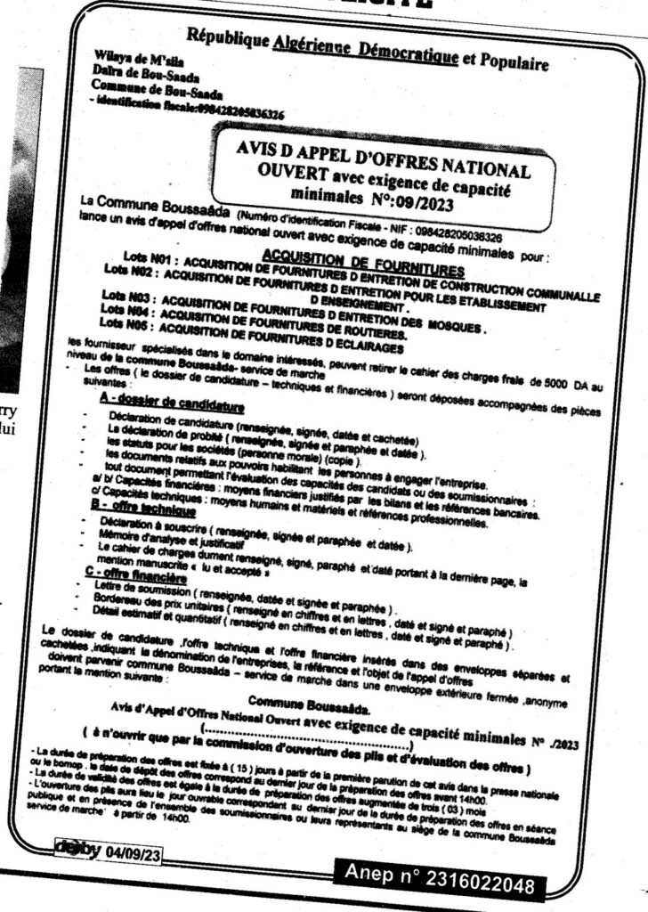 Avis d’appel d’offres national ouvert N°09/2023 Commune de Bou-Saada