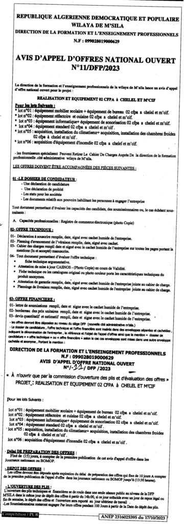 Avis d’appel d’offres national ouvert N°11/2023 Direction de la formation et l’enseignement professionnels
