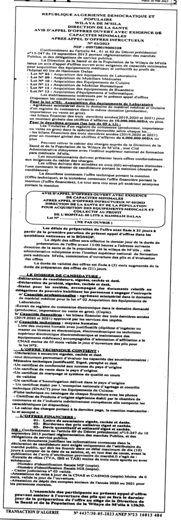 Avis d’appel d’offres ouvert après appel d’offres infructueux N°03/2023 Direction de la santé wilaya de M’sila