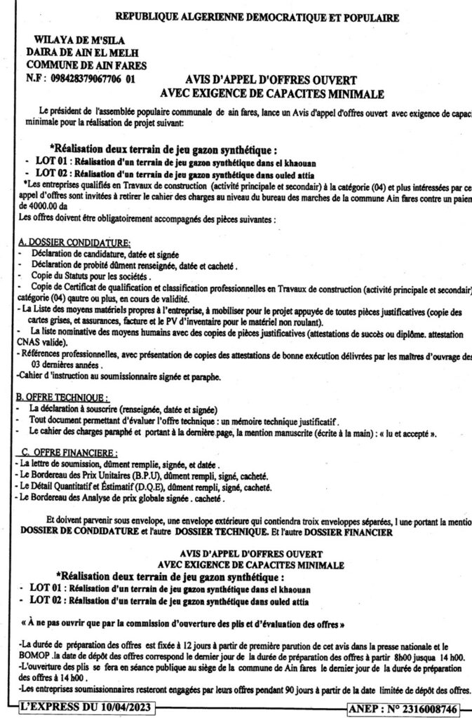 Avis d’Appel d’Offres Ouvert/ Commune de Ain Fares