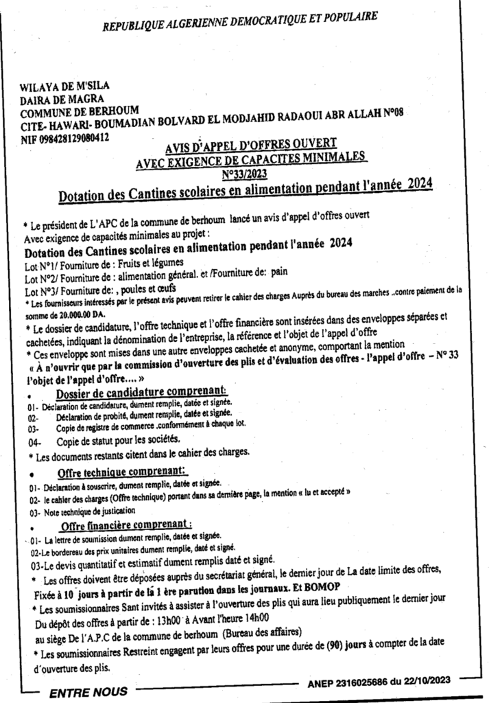 Avis d’appel d’offres ouvert N° 33/2023 Commune de Berhoum