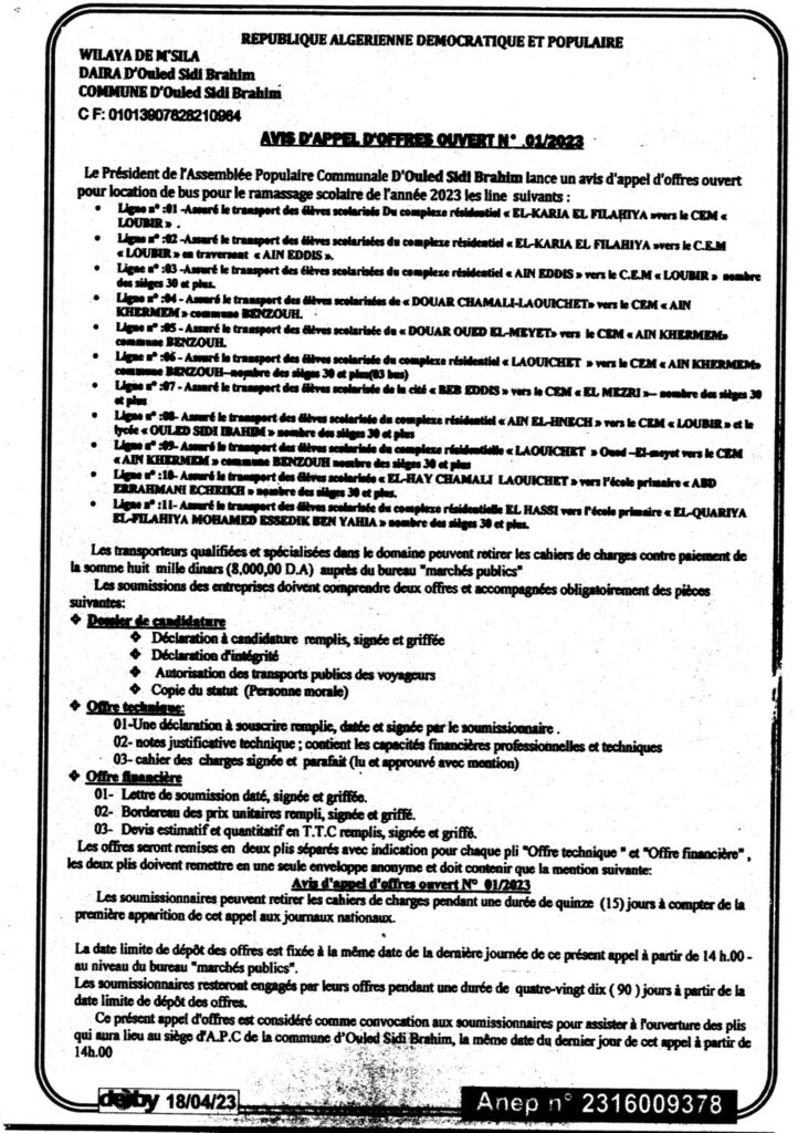 Avis d’appel d’offres ouvert N°01/2023 Commune d’Ouled Sidi Brahim