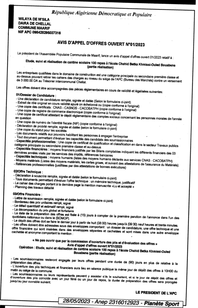 Avis d’appel d’offres ouvert N°01/2023 Commune Maarif