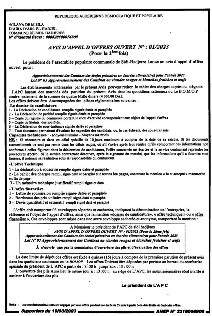 Avis D’Appel D’Offres Ouvert N°01/2023 (Pour la 2éme fois)