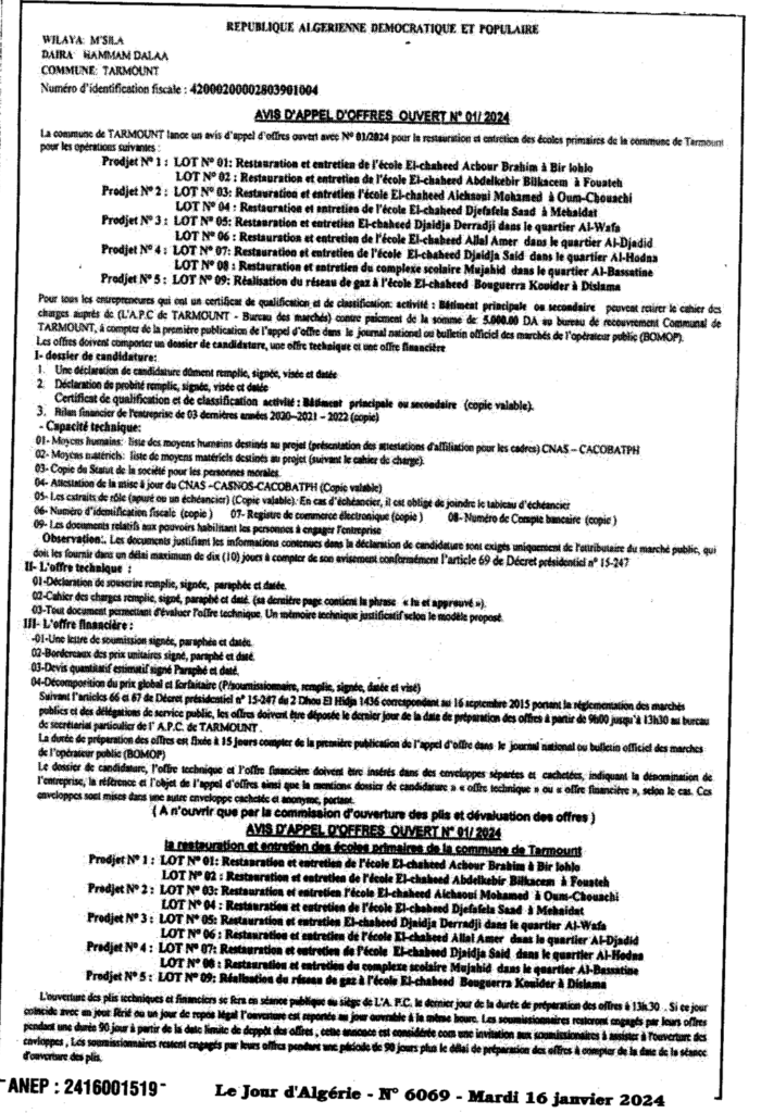 Avis d’appel d’offres ouvert N°01/2024 Commune de Tarmount