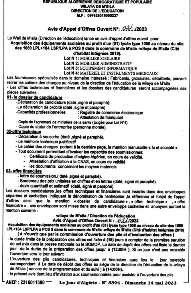 Avis d’Appel d’offres ouvert N°02/2023: Acquisition des équipements scolaires au profit d’un (01) lycées type 1000 au niveau du site des 1050 LPL + 104 LSP/LPA a POS 9 dans la commune de M’sila/ Direction de l’Éducation Wilaya de M’sila