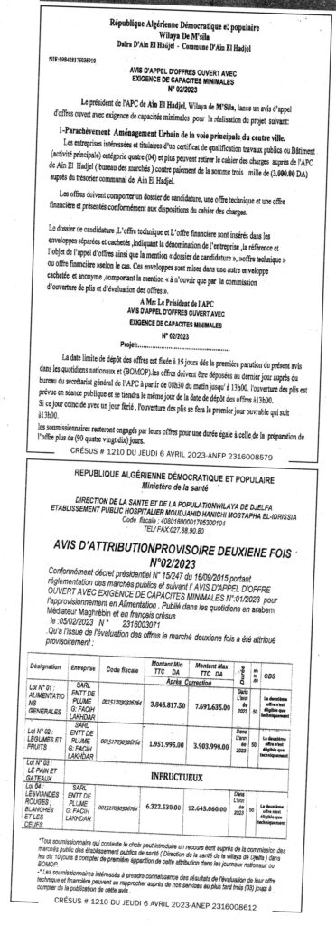 Avis d’Appel d’Offres Ouvert N°02/2023 Commune de Ain-El-Hadjel