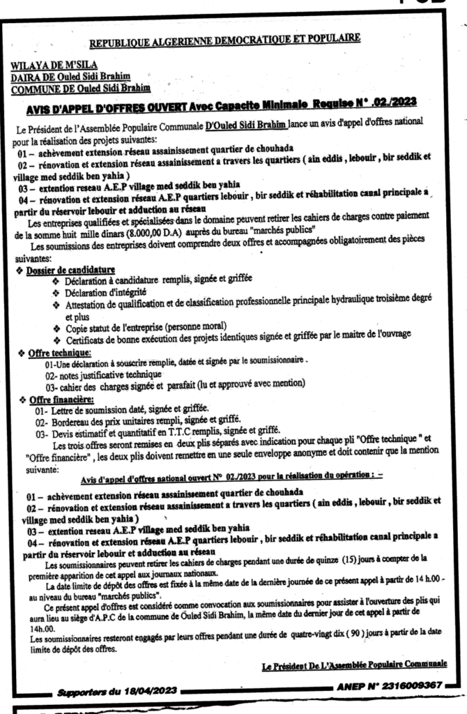 Avis d’Appel d’Offres Ouvert N°02/2023 Commune de Ouled Sidi Brahim