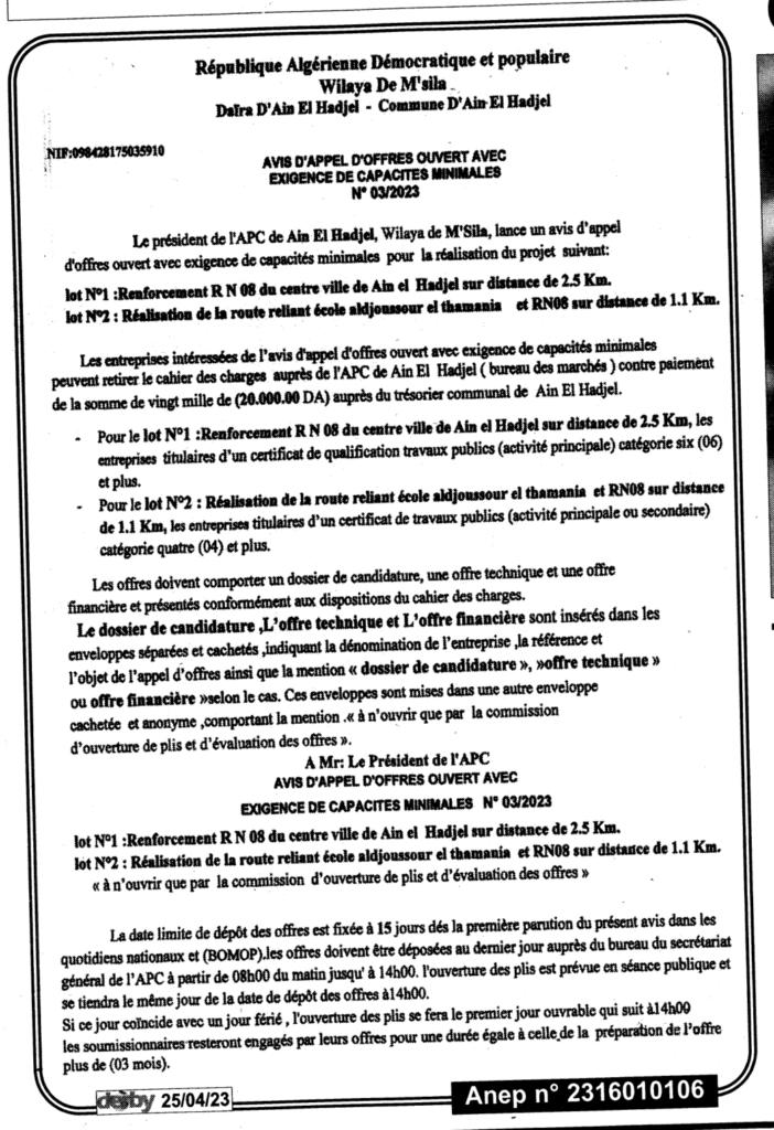 Avis d’appel d’offres ouvert N°03/2023 Commune d’Ain El-Hadjel