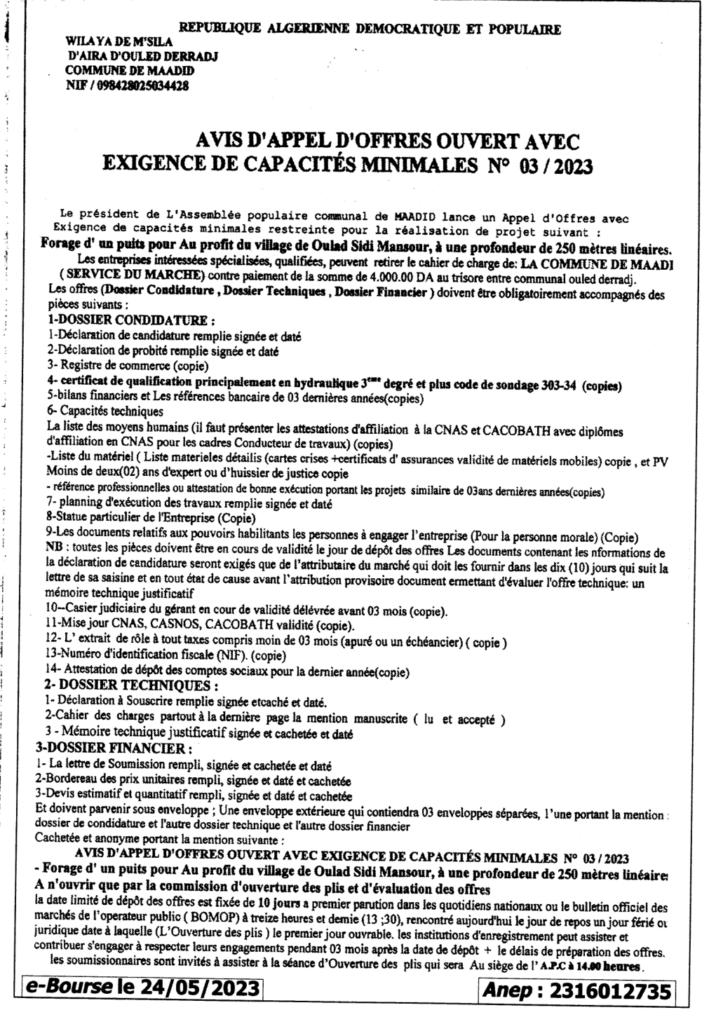 Avis d’appel d’offres ouvert N°03/2023 Commune de Maadid