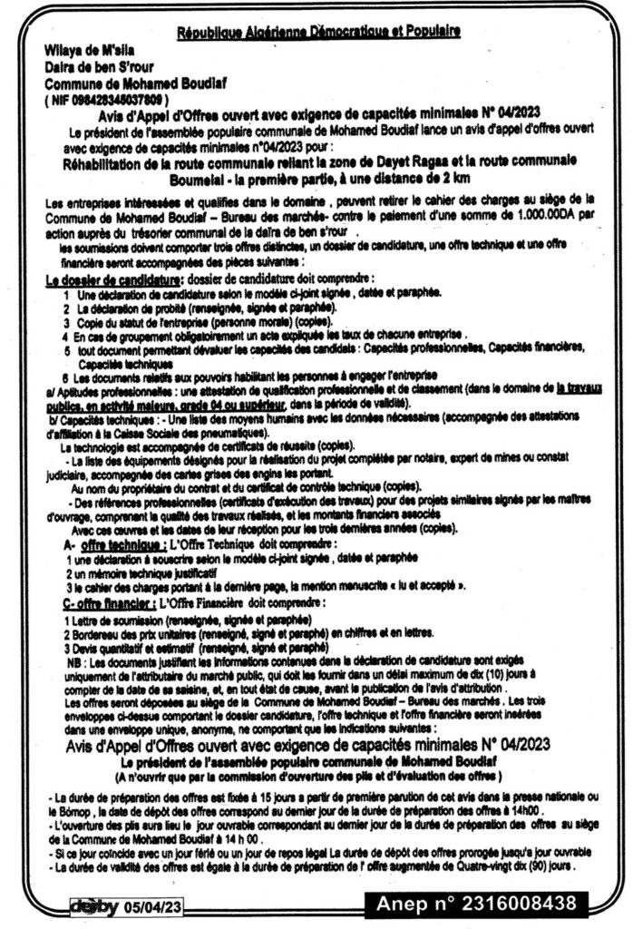 Avis d’Appel d’Offres Ouvert N°04/2023 Commune de Mohamed Boudiaf
