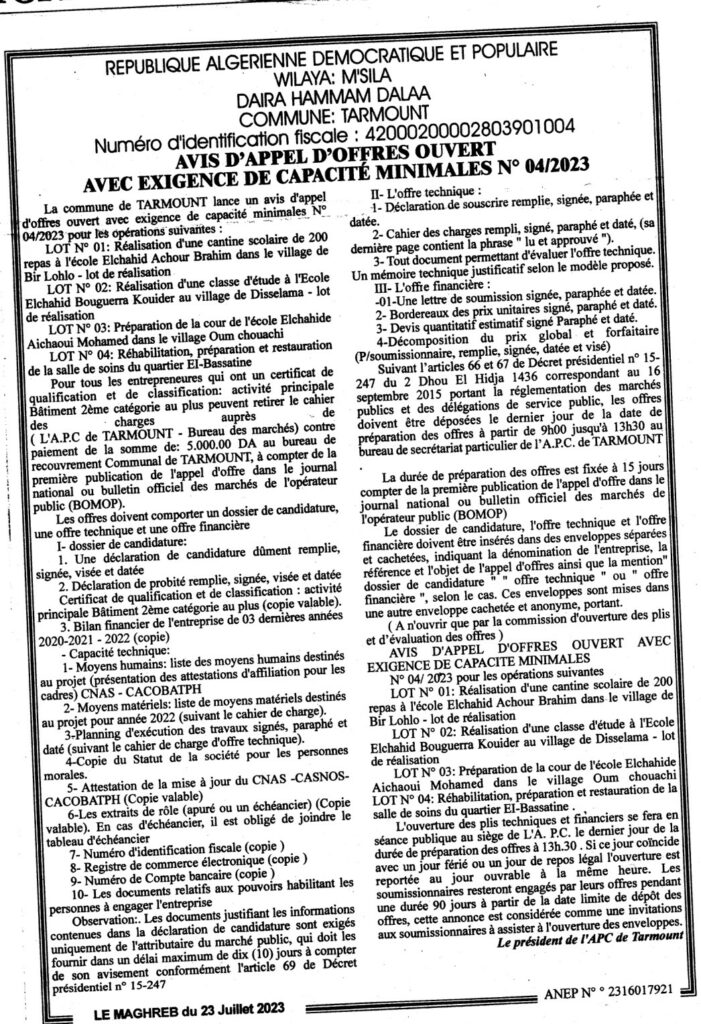 Avis d’appel d’offres ouvert N°04/2023 Commune de Tarmount