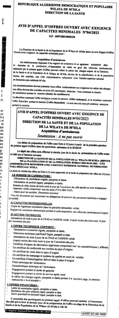 Avis d’appel d’offres ouvert N°04 Direction de la santé wilaya de M’sila