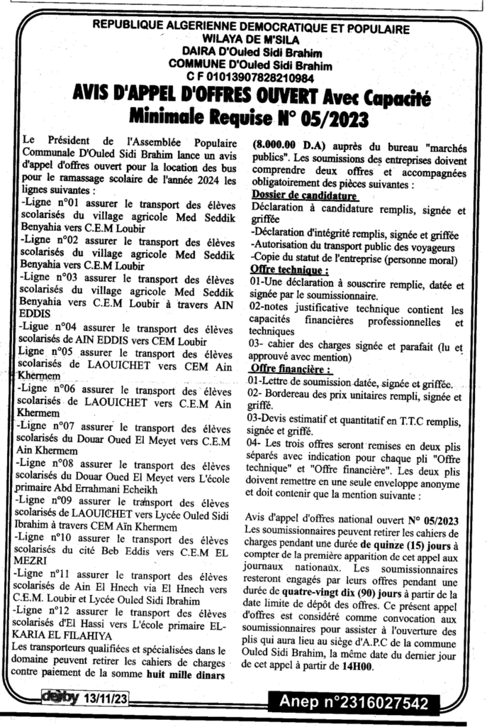Avis d’appel d’offres ouvert N°05/2023 Commune d’Ouled Sidi Brahim