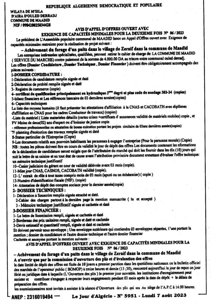 Avis d’appel d’offres ouvert N°06/2023 Commune de Magra