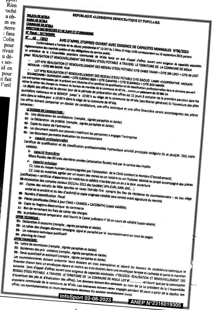 Avis d’appel d’offres ouvert N°06/2023 Commune de M’sila