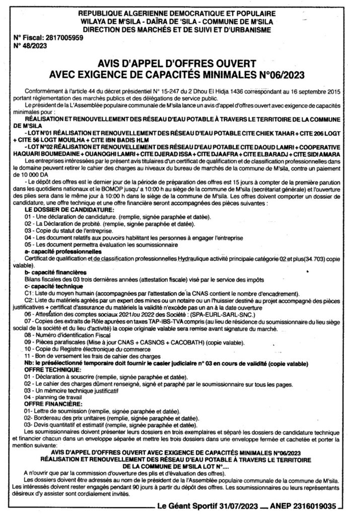 Avis d’appel d’offres ouvert N°06/2023 Commune de M’sila