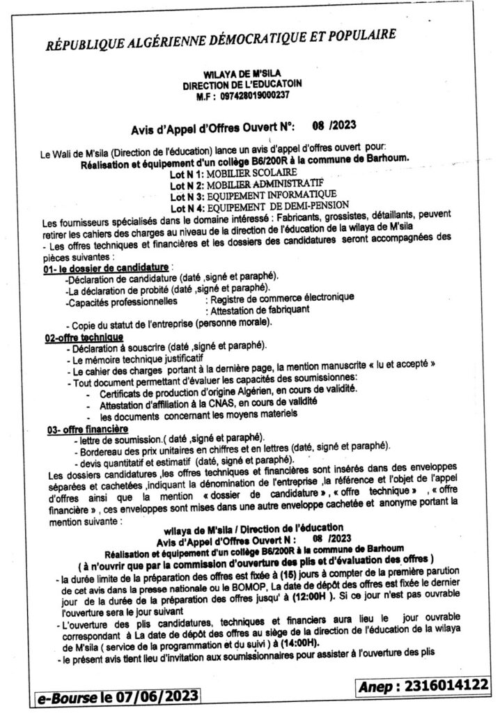 Avis d”appel d’offres ouvert N°08/2023 Direction de l’éducation