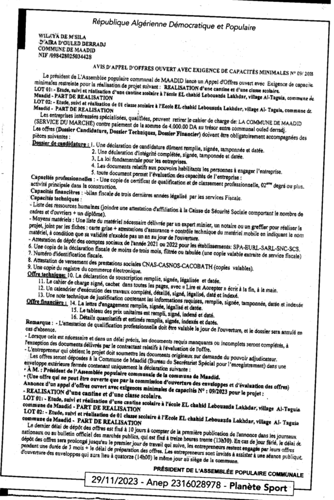 Avis d’appel d’offres ouvert N°09/2023 Commune de Maadid