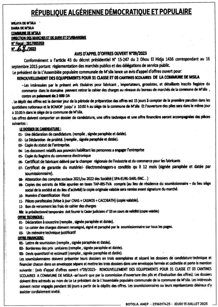 Avis d’appel d’offres ouvert N°09/2023 Commune de M’sila
