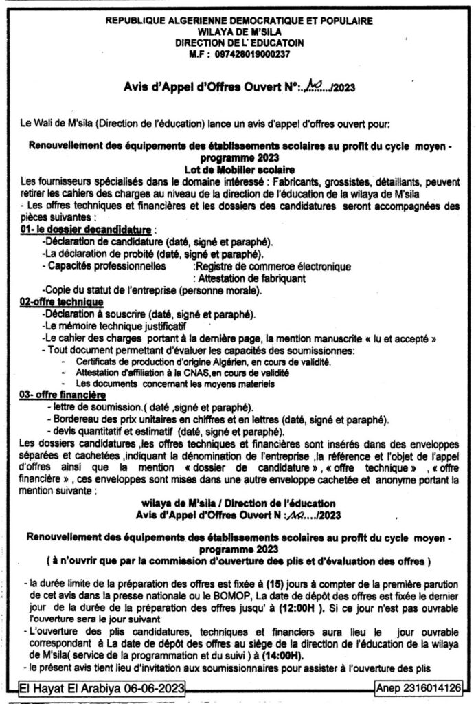 Avis d’appel d’offres ouvert N°10/2023 Direction de L’Éducation