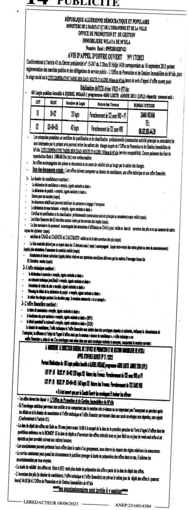 Avis d’appel d’offres ouvert N°17/2023 Office de promotion et gestion immobilière wilaya de M’sila