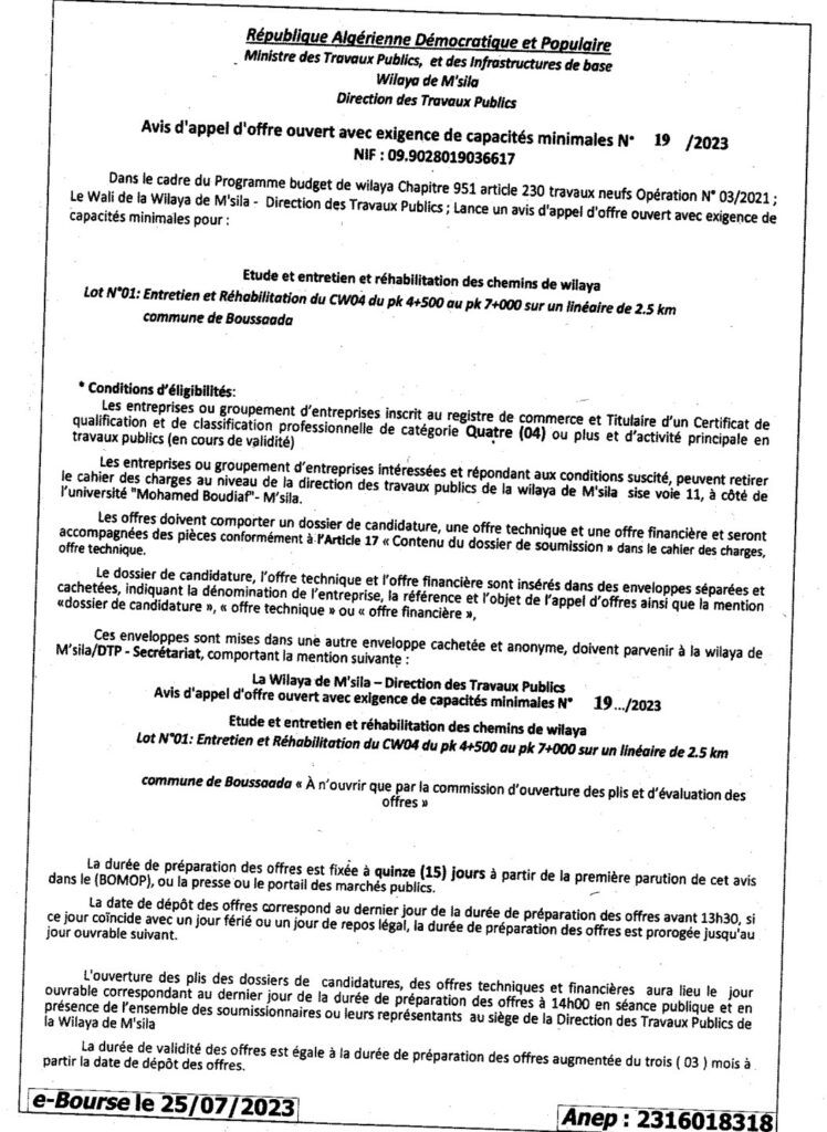 Avis d’appel d’offres ouvert N°19/2023 Direction des travaux publics de la wilaya de M’sila