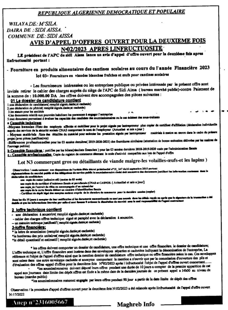 Avis d’Appel d’Offres Ouvert Pour La Deuxième Fois N°02/2023 Après Linfructuosité