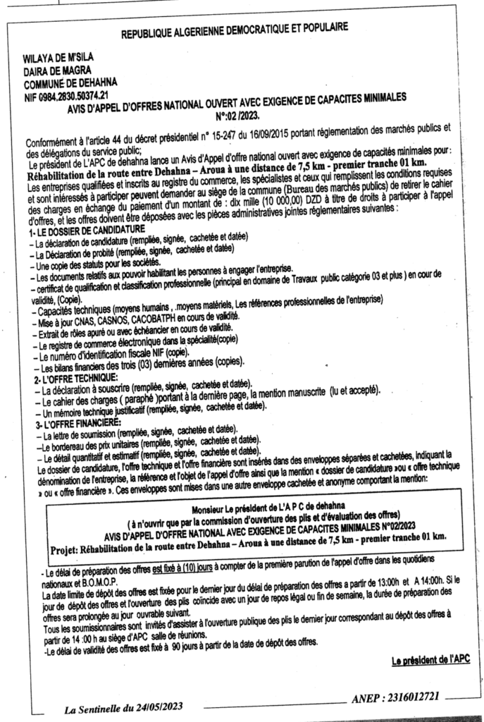 Avis d’appel National ouvert N°02/2023 Commune de Dehahna