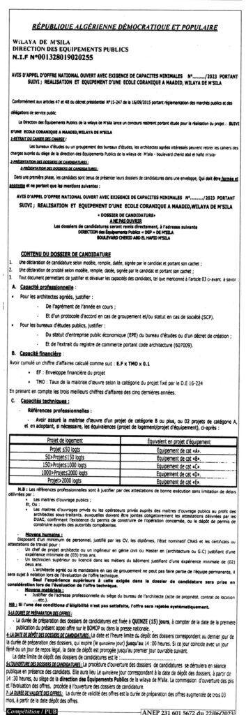Avis d’appel national ouvert portant suivi; réalisation et équipement d’une école coranique a maadid/ Direction des équipements publics