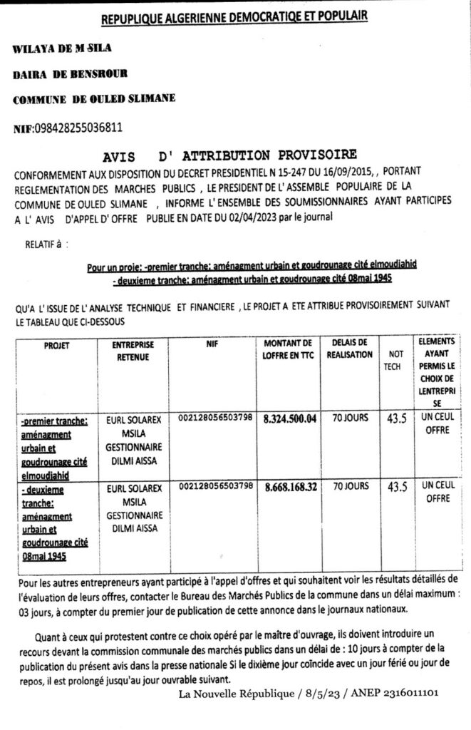 Avis d’attribution provisoire: Aménagement urbain et goudronnage cité elmoudjahid et cité 08 mai/ Commune de Ouled Slimane