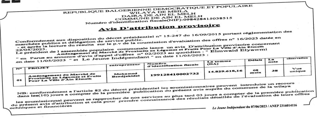 Avis d’attribution provisoire Commune de Ain elHadjel