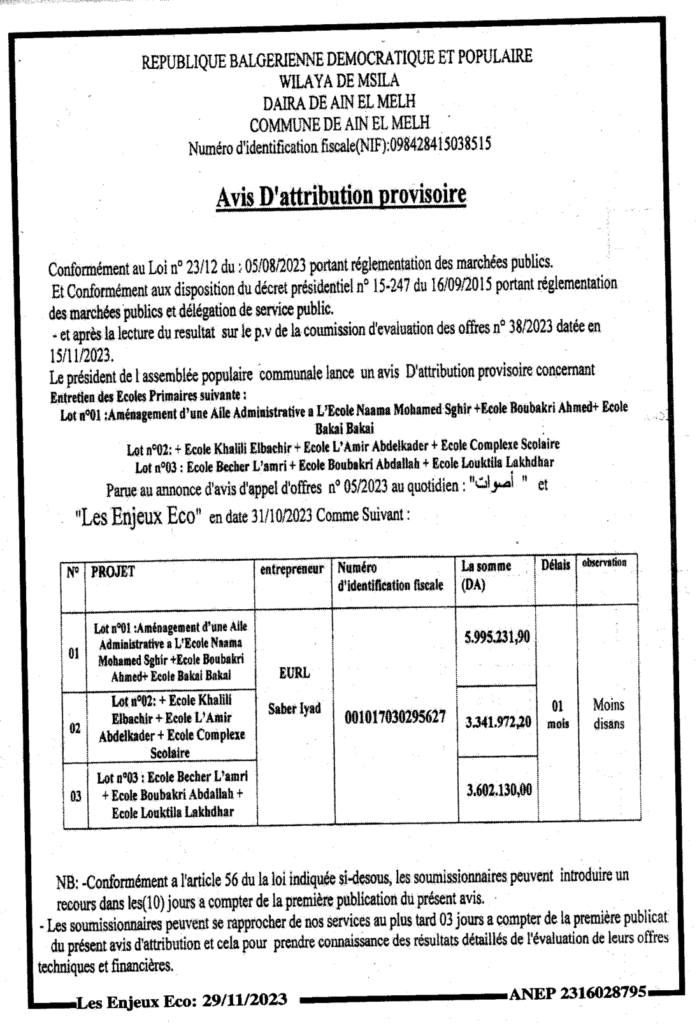 Avis d’attribution provisoire/ Commune de Ain ElMelh