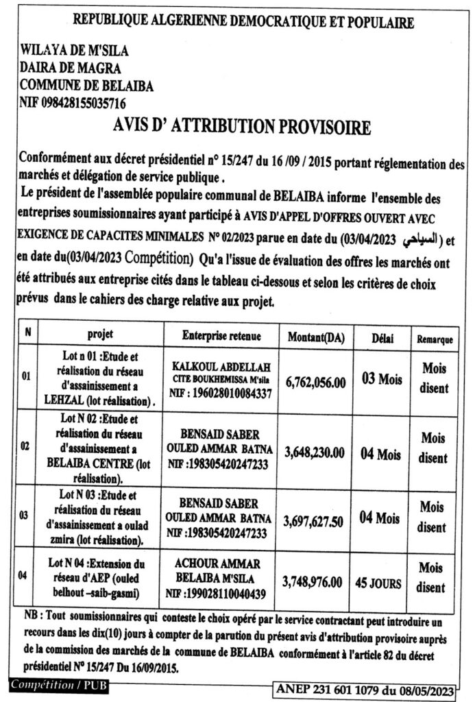 Avis d’Attribution Provisoire/ Commune de Belaiba