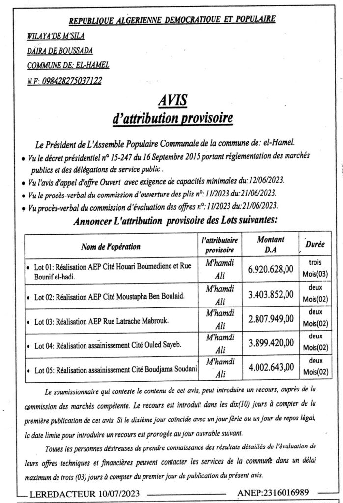 Avis d’attribution provisoire/ Commune de El-Hamel