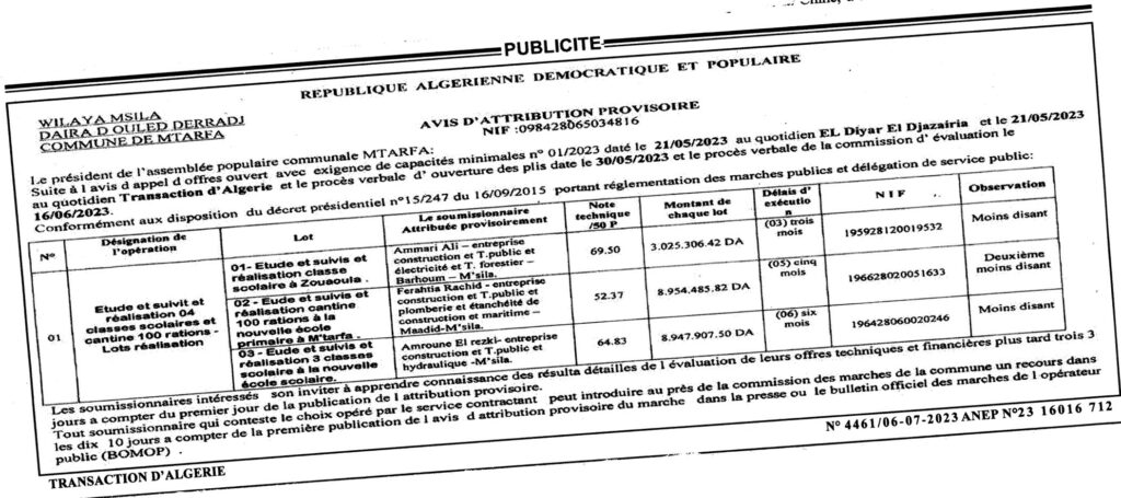 Avis d’attribution provisoire/ Commune de M’tarfa