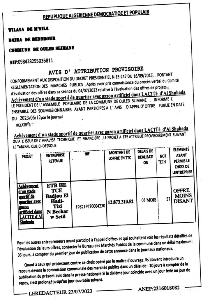 Avis d’attribution provisoire/ Commune de Ouled Slimane
