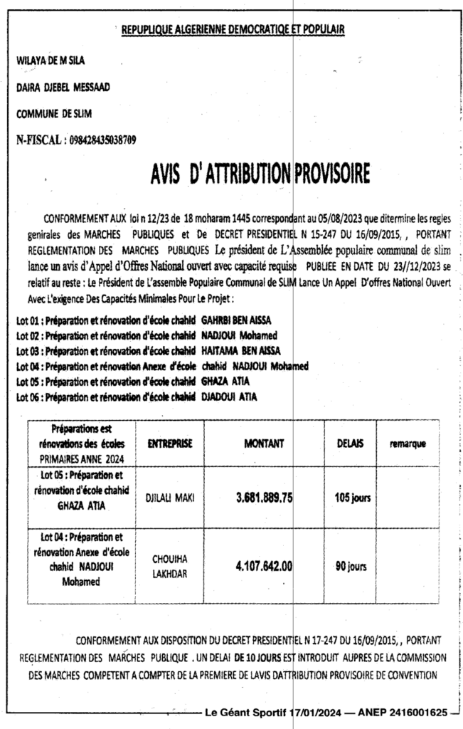 Avis d’attribution provisoire/ Commune de Slim