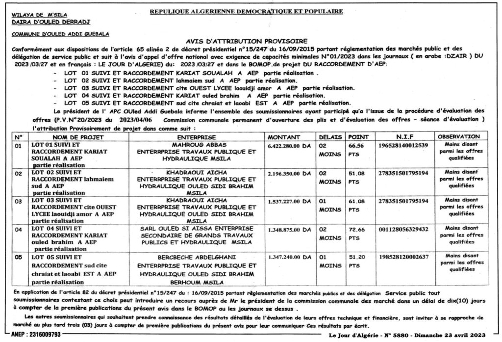 Avis d’attribution provisoire/ Commune d’Ouled Addi Guebala
