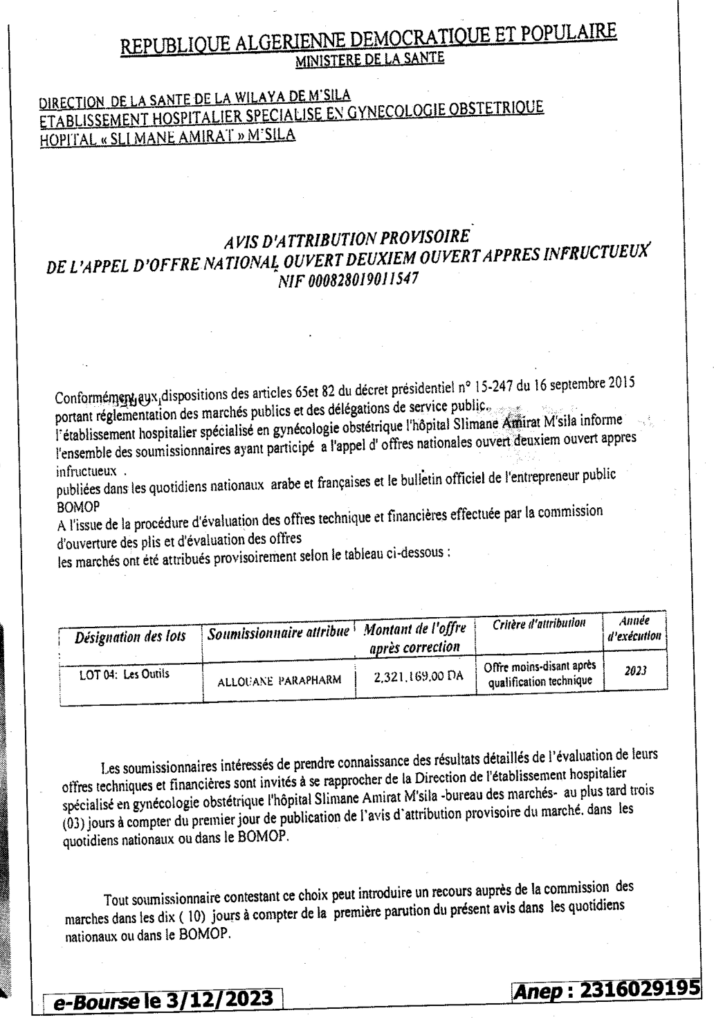 Avis d’attribution provisoire de l’appel d’offre national ouvert deuxième ouvert après infructueux/ Établissement hospitalier spécialise Slimane Amirat M’sila