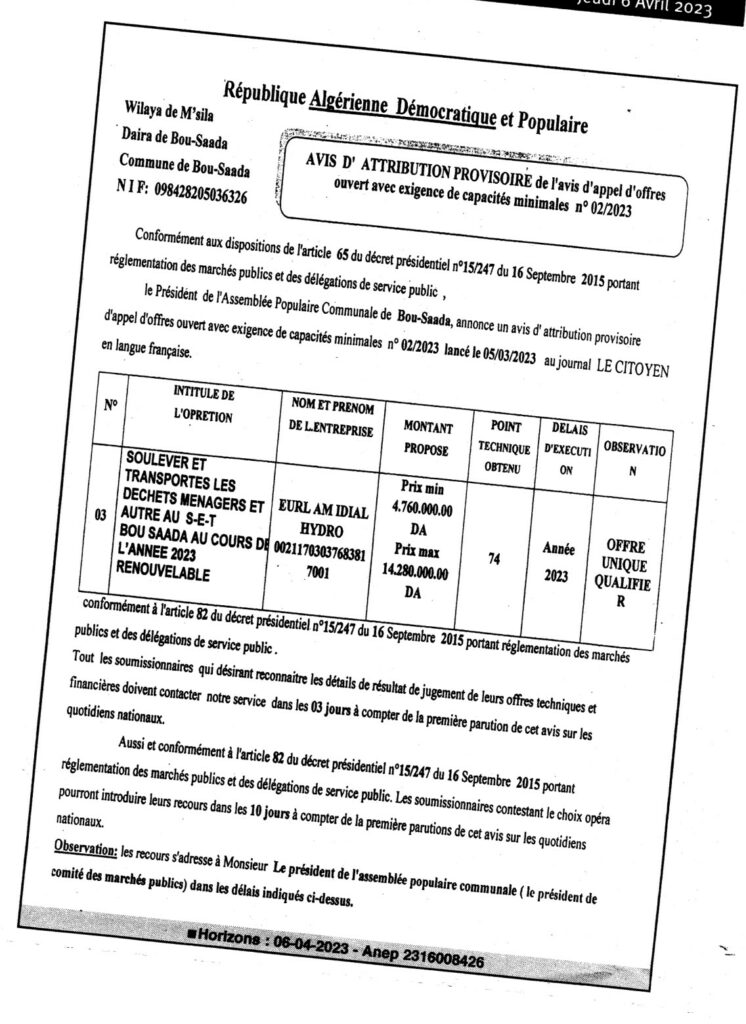 Avis d’Attribution Provisoire de l’Avis d’Appel d’Offres Ouvert N°02/2023 Commune de Bou-Saada