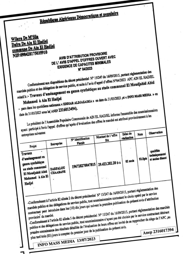 Avis d’attribution provisoire de l’avis d’appel d’offres ouvert N°04/2023 Commune de Ain El Hadjel